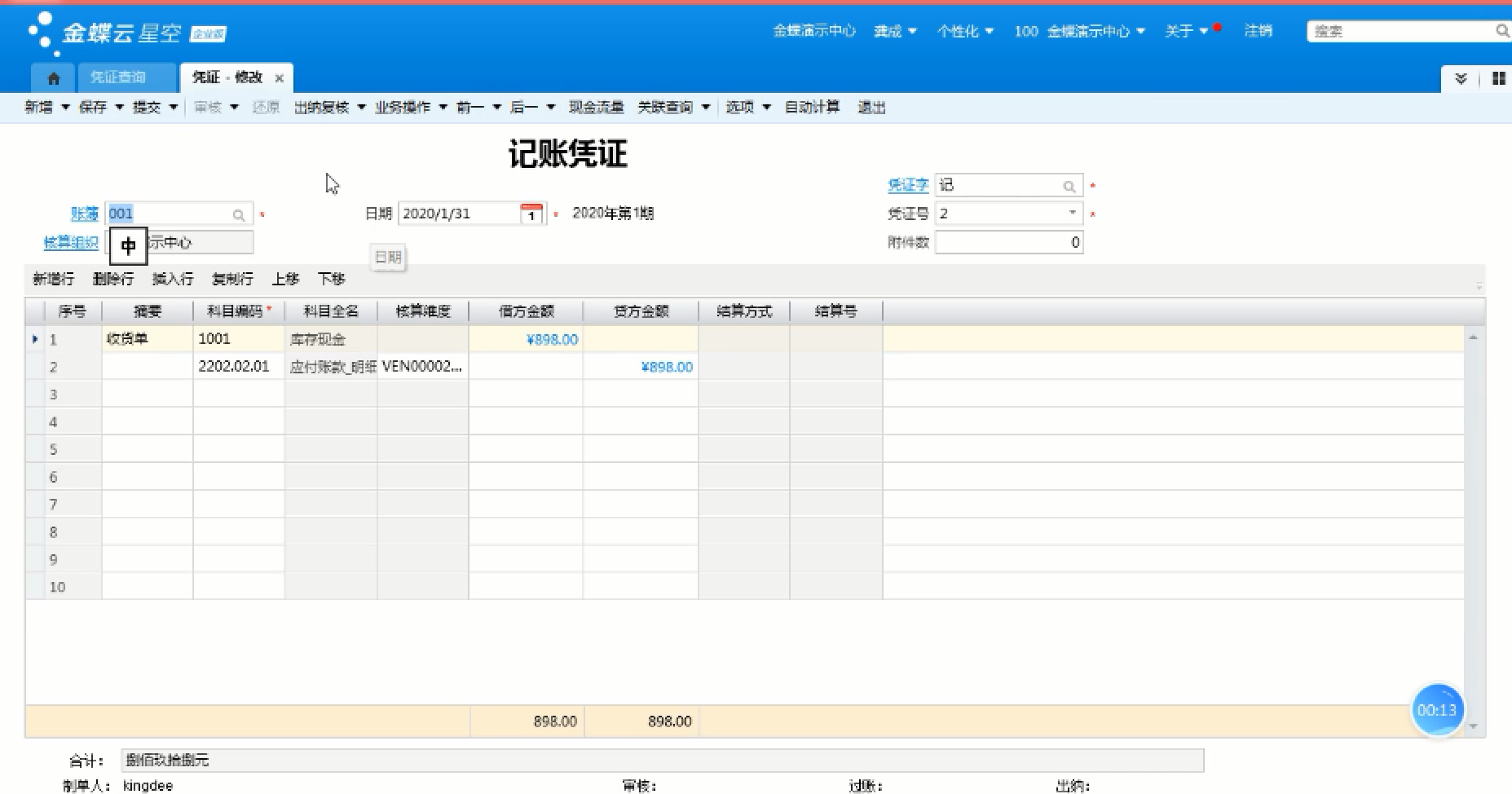 • 金蝶K3允许修改凭证号